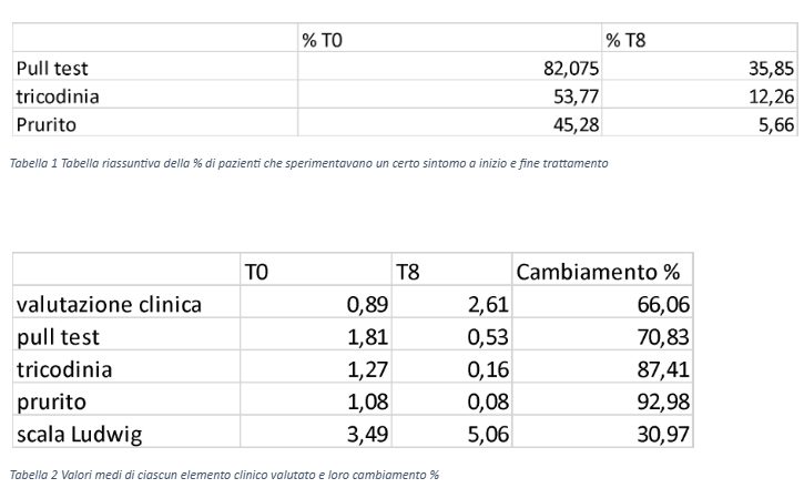 Il ricercatore dopo visita ed anamnesi del paziente ha quindi compilato il questionario a T0 e T8, valutando sintomi clinici quali il risultato del pull test, la presenza di tricodinia e di prurito, usando una scala da 0 a 5, dove 5 indicava una presenza molto forte del sintomo in questione, 0 ne indicava l’assenza. Il ricercatore ha anche valutato il diametro medio dei capelli, con un valore di 5 per un valore osservato di diametro del capello molto buono e 0 per un valore osservato indicante capelli estremamente sottili. Il medico ha quindi espresso il proprio parere sulla situazione clinica del paziente in questione, con un valore di 0 indicante una situazione clinica negativa ed un valore di 5 indicante una situazione clinica molto positiva. Come ulteriore dato clinico è stato annotato il livello di Alopecia secondo la scala di Ludwig, usando numeri da 0 a 7, con 0 indicante assenza totale di capelli in zona apicale del capo e 7 indicante una capigliatura perfettamente normale. Inoltre sono stati espressi valori di soddisfazione per l’efficacia e la tollerabilità da parte del medico e del paziente alla fine dello studio.