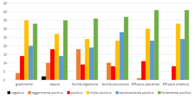 Allo studio hanno partecipato un totale di 106 pazienti in menopausa, di età compresa tra i 44 ed i 95 anni, l’età media delle pazienti è risultata essere di 61,77 anni. A seguito degli 8 mesi di terapia è stato chiesto ai pazienti quale fosse il loro grado di soddisfazione per la terapia, ponendo domande in merito al sapore del prodotto, alla sua efficacia (valutata sia dal medico che dalla paziente), facilità di digestione e facilità di assunzione. La valutazione era possibile tramite scheda con valori da 0 a 5, dove 0 indicava un valore di gradimento negativo e 5 un valore fortemente positivo. Nessun paziente ha riportato giudizi negativi in merito alla terapia cui è stata sottoposta, fatta esclusione per due pazienti che hanno giudicato come non gradevole il sapore del nutraceutico assunto. I giudizi per le altre categorie si sono attestati principalmente sul valore di molto positivo (3) oppure fortemente positivo (5).