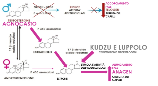 Questo stimola l’attività dell’adenilato ciclasi allungando la fase di ANAGEN. L’Agnocasto inoltre regola i livelli di progesterone, influenzando il rapporto Progesterone/Estrone a favore del primo.